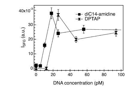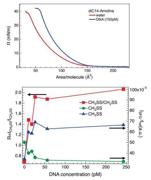 图7。(上图)在不存在(红线)和存在(蓝线,150μm)DNA的情况下,磷酸缓冲亚相上方的diC14氨基单层的π-面积等温线。对于给定的脂质密度,将DNA添加到亚相会导致表面压力增加,或者相当于脂质分子的凝聚。(下图)不同浓度的DNA溶液上的CH2SS和CH3SS共振(三角形和圆形,右轴)的VSF强度及其比率R(正方形,左轴)。实线是眼睛的向导。