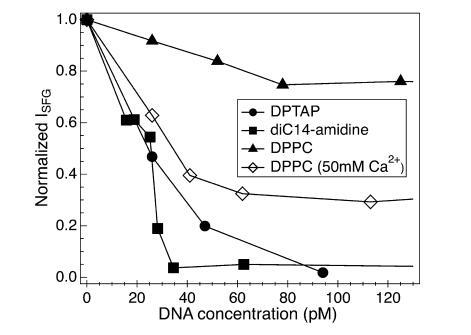 图7(上图)所示的压缩等温线清楚地表明,DNA对diC14氨基单层膜的影响,在很大的密度范围内,是增加表面压力,或等效地降低表面张力。也就是说,加入DNA后,表面生成的自由能总是变得更有利。然而,在没有进一步信息的情况下,这些实验几乎无法深入了解表面热力学变化的分子基础。双14-氨基单分子膜的CH区域的VSF光谱作为DNA浓度的函数,以及由此产生的CH3SS/CH2 SS比率,提供了这样的见解。如图7(下图)所示,向亚相添加DNA,即使在40 pM以下的体积浓度下,也会导致脂质尾部顺序的强烈增加。在解释电子自旋共振研究的结果时,贝纳蒂及其同事曾认为,吸附的DNA使凝胶相双氰胺双层(低于23°C)流态化,并使液相双层(高于23°C)僵化,从而有效地平滑了在没有DNA的情况下急剧的热相变。91XVDEVIOS官方下载免费版的光学和压力等温线测量都是在略低于熔融温度的情况下进行的。XVDEVIOS官方下载免费版的压缩等温线表明,DNA的作用是增加表面上单个链之间的相互作用(降低表面张力),而光学测量表明,链相互作用的增加导致脂质尾部更有序。有趣的是,这些结果与这样一种情况是一致的,即DNA的加入似乎会产生脂质,两者之间的相互作用比没有DNA时更强烈,尾巴比没有DNA时更有序,链的流动性增强。这种脂链流动性和脂链顺序的解耦类似于之前观察到的胆固醇和DPPC混合物随温度变化的情况。92