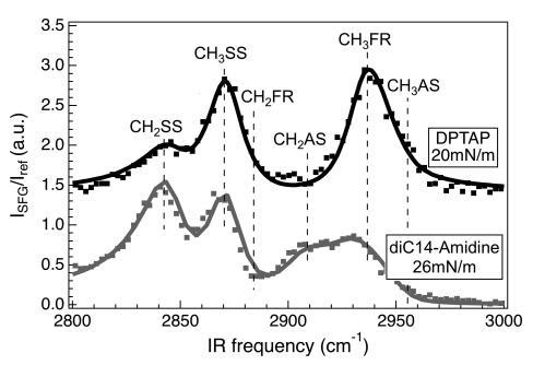 图6。diC14 amdine在26 mN/m(灰色)下的SFG光谱(点)和DPTAP(黑色)在20 mN/m下的SFG光谱(点)。垂直线表示亚甲基对称拉伸(CH2SS)、甲基对称拉伸(CH3SS)、亚甲基非对称拉伸费米共振(CH2FR)、亚甲基非对称拉伸(CH2AS)的位置,甲基对称拉伸费米共振(CH3FR)和甲基不对称拉伸(CH3AS)。为清晰起见,DPTAP频谱偏移。实体曲线使用洛伦兹模型拟合数据。