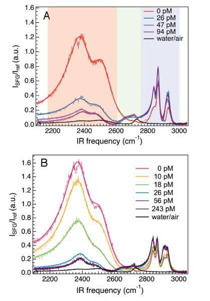 界面水的光谱响应。图2显示了在2100-3100 cm-1范围内,随着亚相DNA浓度的增加,DPTAP、diC14氨基和DPPC单分子膜的VSF光谱。对这些数据的粗略检查显示出几个特征。聚焦于图2面板A,从低频向高频移动,很明显,有一个巨大的双峰结构,随着DNA的加入,其振幅突然降低(透明的红色矩形);一个小的、更高频率的峰值(以≈2675 cm-1),随着DNA(透明绿色矩形)的加入而增加;在2800-2950 cm-1的频率范围内有几个较窄的峰值(这些峰值是CH拉伸振动的结果,显示在一个透明的蓝色矩形中,下面将进一步讨论)。