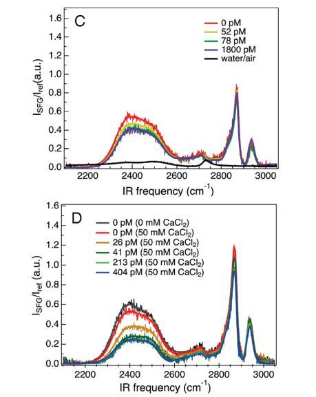 图2。VSF光谱是OD拉伸区2100-2700 cm-1和CH拉伸区2850-2975 cm-1的DNA浓度的函数。阳离子脂质单分子膜的脂质密度为52Å2/分子,两性离子脂质单分子膜的脂质密度为47Å2/分子。A组为DPTAP单层下的VSF光谱,B组为diC14氨基单层下的VSF光谱,C组为DPPC单层下的VSF光谱,D组为含有额外50 mM CaCl2的DPPC单层下的VSF光谱。所有实验中的亚相都是磷酸盐缓冲的。每个面板中的单个光谱是具有不同浓度λ-DNA噬菌体的相同系统。每个面板中都显示了该频率窗口的磷酸盐缓冲D2O光谱,以供比较。实体曲线使用公式1拟合数据。