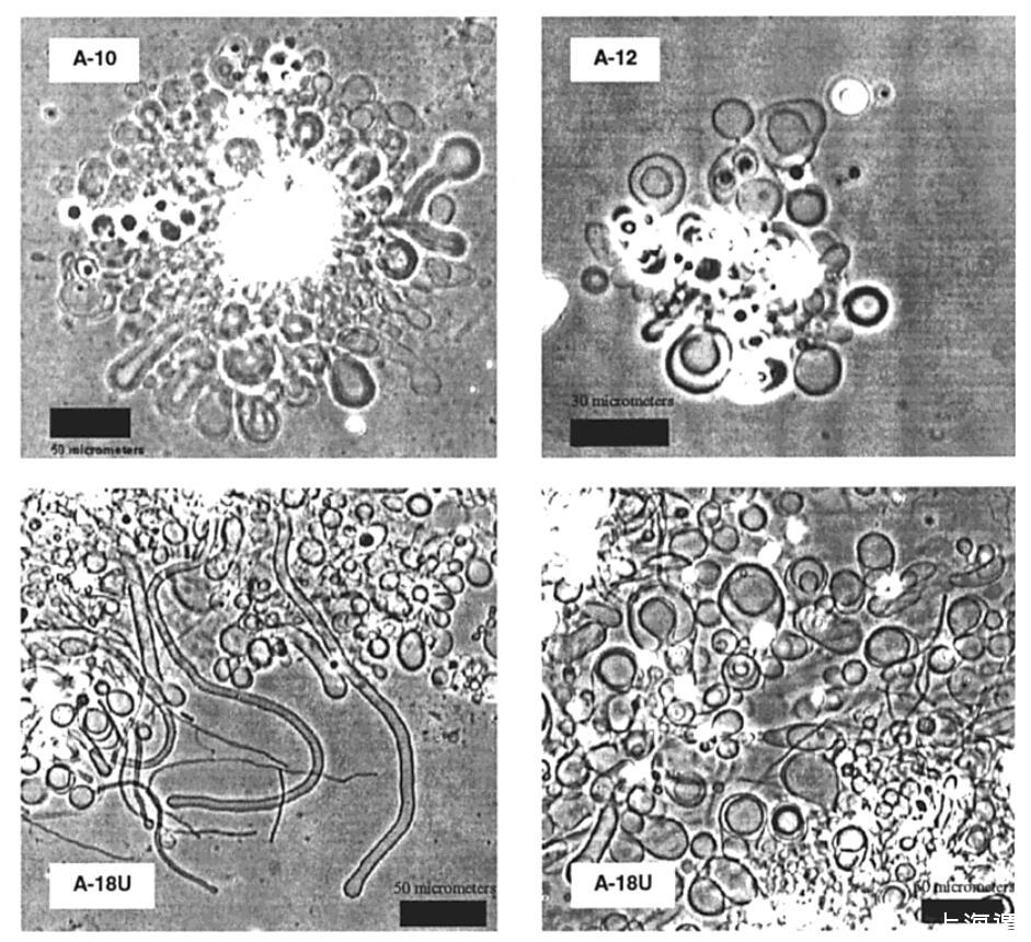 图2。A-10(左上)、A-12(右上)和A-18U(下)在23°C下水合3-4小时后形成的囊泡和管状结构的相衬显微照片。在45°C下培养的A-14和A-16样品中观察到类似结构。