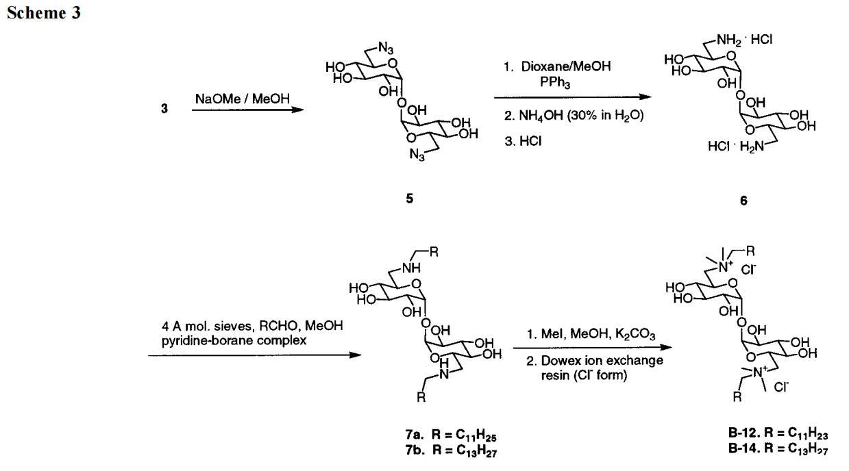接下来,XVDEVIOS官方下载免费版提出了在海藻糖衍生物上放置阳离子基团以改善其水溶性的想法。必须承认,XVDEVIOS官方下载免费版对更易管理的水溶性化合物的前景感到一定程度的高兴。B系列就这样出现了。然而,XVDEVIOS官方下载免费版立即面临新的问题。虽然B-12和B-14是作为纯化合物获得的,但B-16和B-18并非如此。后两种Gemini的产率较低,提供了令人满意的光谱数据,但它们的元素分析偏离了理论1-2%(这使XVDEVIOS官方下载免费版怀疑存在无机杂质)。无论如何,由于B-16和B-18不符合XVDEVIOS官方下载免费版的高纯度标准,XVDEVIOS官方下载免费版在注意力上轻视了它们,而偏爱它们的矮表亲。