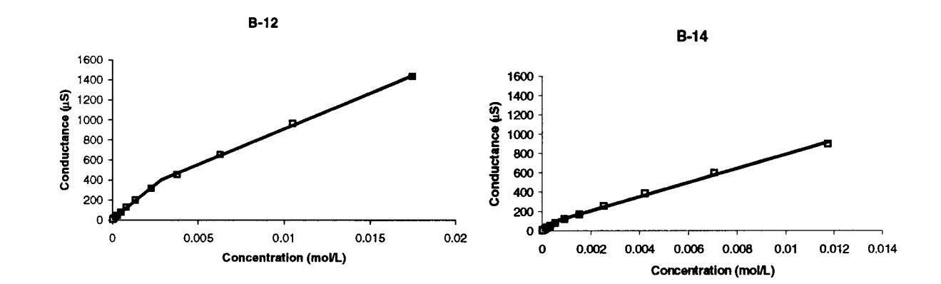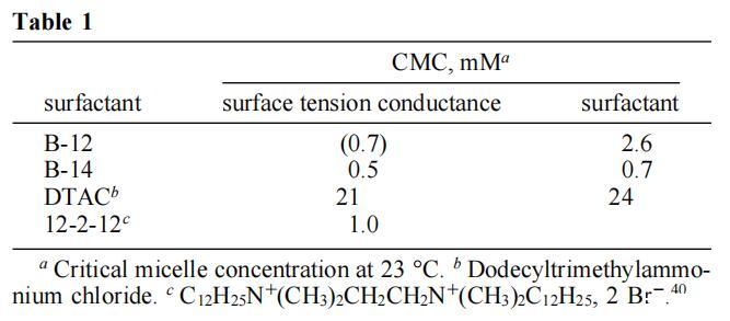 图5。图中给出了B-12和B-14临界胶束浓度,该浓度由电导-浓度曲线中的断裂点确定。每个点代表23°C下的单个电极读数。