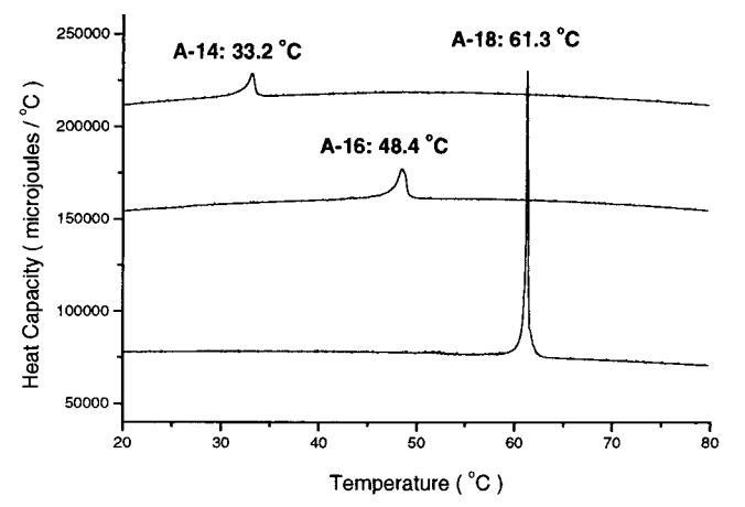 图3。通过差示扫描量热法(DSC)在10°C/h的加热速率下获得的双子座A-14、A-16和A-18的2 mg/mL悬浮液的吸热峰。