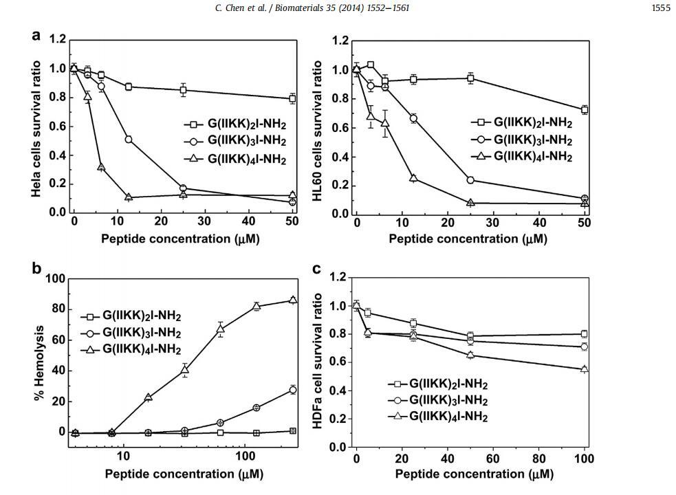 在一系列短肽G(IIKK)nI-NH2(n¼1e4)中,G(IIKK)3I-NH2代表了体外抗癌活性和细胞选择性方面的最佳链长,与之前在抗菌活性和选择性方面的观察结果一致。已经证明,对细菌和癌细胞的共同鉴别反应源于肽通过静电相互作用和疏水效应之间的平衡而产生的选择性反应。具体而言,负表面电荷和高不饱和脂链驱动的高亲和力导致G(IIKK)3I-NH2与癌细胞膜的快速结合和随后的膜通透性。然后,肽分子通过脂质双层转运,并在癌细胞内部积聚。这一过程产生了一系列细胞凋亡的形态学和生化特征,表明肽处理的癌细胞因膜破坏和凋亡而死亡。此外,这项工作还揭示了肽诱导的癌细胞凋亡与两个特征性的分子过程有关:线粒体途径和死亡受体途径。最后,该肽在与淋巴细胞相互作用后不会诱导非特异性免疫原性反应,重要的是,这些设计的肽在异种移植模型中显示出相当大的体内抗肿瘤作用,而毒性很小,这两者都表明它们作为功能材料在生物技术和临床应用中的潜力。