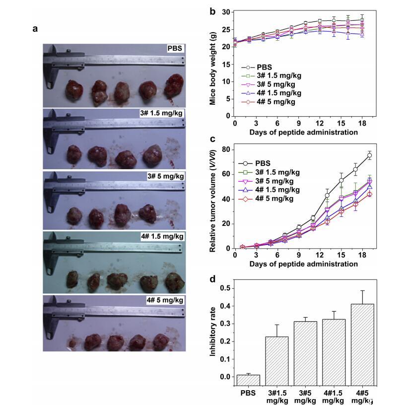 将人宫颈癌HeLa细胞接种于裸鼠皮下。肿瘤植入5天后,分别以1.5 mg/kg和5 mg/kg的剂量腹腔注射肽G(IIKK)3INH2和G(IIKK)4I-NH2。在给药期间,未观察到任何毒性迹象,如体重减轻和外观不良(图6b),尽管G(IIKK)4I-NH2显示出更高的体外溶血性。与PBS中的阴性对照相比,这两种肽对肿瘤生长表现出明显的抑制作用,其中G(IIKK)4I-NH2表现出比G(IIKK)3I-NH2更好的疗效(图6c),这与它们的体外抗肿瘤趋势一致。18天后,解剖肿瘤并称重(图6a和d)。在1.5 mg/kg和5 mg/kg剂量下,G(IIKK)3I-NH2治疗组的肿瘤生长抑制率分别为0.23和0.31。G(IIKK)4I-NH2能产生更有效的抑制作用,在1.5 mg/kg和5 mg/kg剂量下,抑制率分别为0.32和0.41。这些数据表明,在小鼠异种移植模型中,螺旋肽可以有效地抑制肿瘤生长,而肿瘤细胞不能被完全清除。许多抗肿瘤药物的不完全抑制作用已被广泛观察到,这可归因于多种机制,例如药物从肿瘤部位相对较快地清除,以及它们难以通过坏死区域扩散[42],但目前这组肽背后的确切原因有待进一步的机理研究。