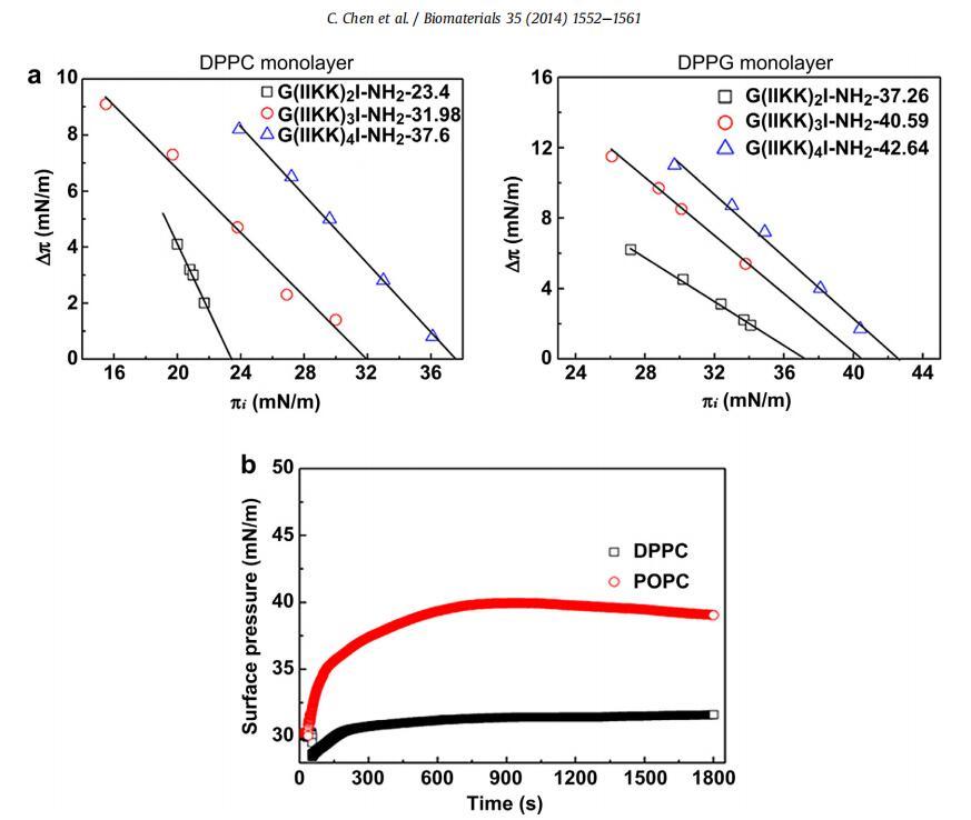 图2。肽与不同脂质单层的相互作用。(a)当肽以3 mM浓度注入亚相时,在不同初始表面压力(pi)下,DPPC和DPPG单分子膜的表面压力增加(Dp)。(b)将G(IIKK)3I-NH2注入DPPC和POPC单分子膜的亚相后的表面压力与时间的关系。