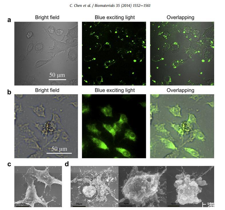 图3。肽的原位定位和质膜完整性。(a)用10mM FITC-G(IIKK)3I-NH2孵育1h后HeLa细胞中的肽位置。(b)用10mM FITC-G(IIKK)3I-NH2孵育24h后HeLa细胞中的肽位置。(c)未经处理的HeLa细胞的代表性SEM显微照片。(d)用10mM G(IIKK)3I-NH2处理24小时的HeLa细胞的代表性SEM显微照片。