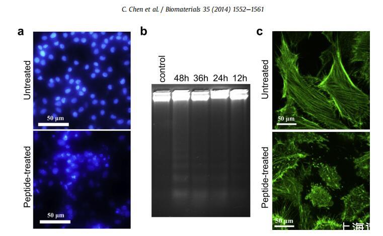 图4。细胞凋亡的生化和形态学特征。(a)HeLa细胞与10 mM G(IIKK)3I-NH2孵育24小时前后的DAPI核染色。(b)HeLa细胞与10 mM G(IIKK)3I-NH2孵育后提取的基因组DNA的凝胶电泳分析。(c)在与10 mM G(IIKK)3I-NH2孵育24小时之前和之后,用FITC phalloidin对HeLa细胞进行F-肌动蛋白染色。