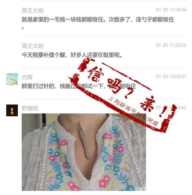 近日,多条“做完核酸检测身体变磁铁”的消息在微信群中流传,有人称广东一女子做完核酸检测一个星期之内,身体吸住了金属!根据这些消息,有人称“以后不要再做核酸检测了,越做身上‘磁’越多”,甚至有人号召大家拒绝做核酸检测。