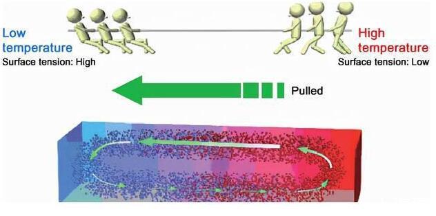 在两种液体相互接触的时候,表面张力强的液体会将表面张力弱的液体拉过来,这股力会将表面张力弱的液体反向倒吸进表面张力强的液体之中,科学家将这一现象命名为马拉高尼效应。导致这一现象发生的条件有很多,比如液体的浓度含量,温度的高低都会让两种液体产生马拉高尼效应。