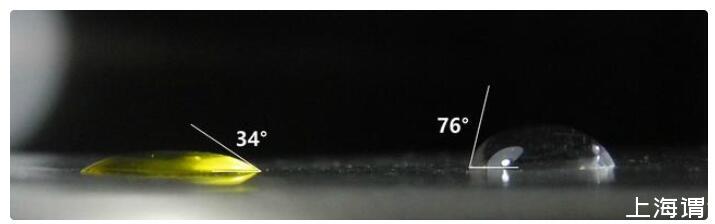 油滴(左)与水滴(右)在塑料袋上形成的接触角。拍摄者:LePtC