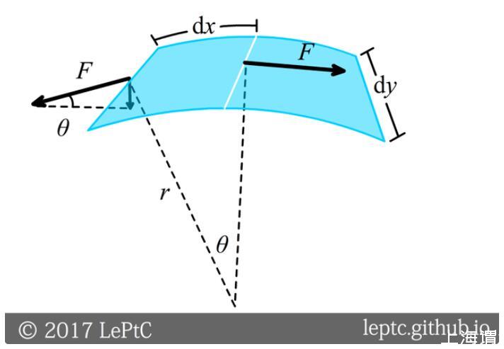 假设膜在x的方向弯曲,曲率半径为r,作用在一个微小的长度dy上的表面张力F=σdy,sinθ≈dx/r,指向球内的合力为Fsinθ=σdxdy/r(没有乘2是因为每条边的力被相邻两个面元共用),这一力由压强差平衡,除以面积dxdy得压强差为σ/r。对于球面x和y方向都弯,故球内压强比球外大2σ/r(对于肥皂泡因为有两层界面还要再乘2)。
