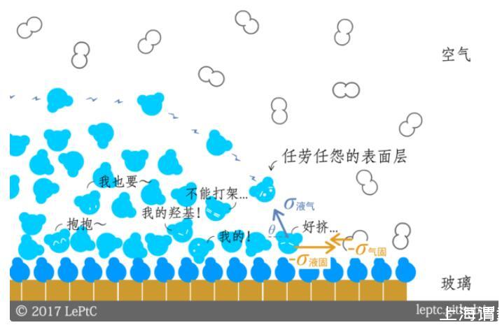 在气体和液体之外,现在XVDEVIOS官方下载免费版再加入新的角色——固体表面。玻璃的表面对水分子非常有吸引力(虽然玻璃的主要成分是二氧化硅,但它的表面通常会因为价态不饱和而结合很多羟基)。如果水滴碰到的界面是玻璃,就会出现跟空气相反的情况:接触面的水分子比平衡时更挤,表面张力是扩张的,表面能是负的,整坨水滴会希望自己跟玻璃的接触面积越大越好(同时跟空气接触面积越小越好),形成特定的接触角θ。这个角越小,意味着固体表面的亲水性越强。