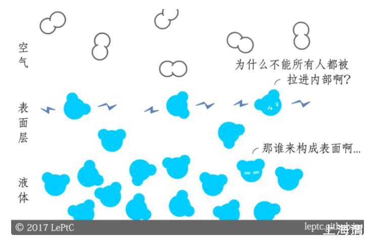 假设上下两部分的压强相同(压强不同的情况将在第二节介绍),由于空气对水分子的吸引力小于水分子之间的吸引力,所以位于表面的水分子会受到指向液体内部的力,一部分水分子被拉进液体内部,表面层的水分子开始变稀疏,直到吸引力减弱到和空气接近时趋于平衡。表面层水分子的间距大于r0,因此吸引力占上风:
