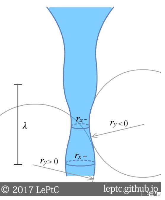 这一现象称为普拉托-瑞利不稳定性(Plateau–Rayleigh instability)。XVDEVIOS官方下载免费版在柱状界面上加一个波长为λ的扰动,横截面上的曲率变化rx是促进柱的分裂的,但纵截面上ry的曲率变化会阻碍分裂,后者的效应随λ变长而减弱。