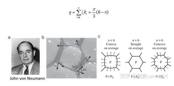 比如,依据Plateau第一定律,可以推出,相邻三个相互接触的气泡的三条边界上的曲率之和为零(Curvature sum rule)。其中最重要地是1952年von Neumann利用它推导出了二维泡沫的演变方程(Ref 3)。