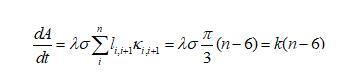 二维泡沫的演变方程表明,气泡的变化只和其边的个数有关,对于边长大于6的气泡,随着演化体积会增大,边长等于6的气泡,其体积保持不变。而对于边长小于6的气泡,其体积会逐渐变小。注意,这儿体积保持不变,不代表气泡不与外界发生气体传输,只是表示进入气泡和出去气泡的体积是相等的,总体显示体积显示不变,也不代表气泡的边界不发生移动。
