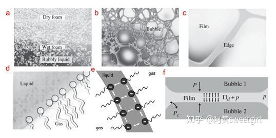 图1.不同尺度下的泡沫结构及稳定机制(Ref 1)(a)整个泡沫结构,尺度为0.01 m至1 m。(b)干泡沫的放大部分,尺度为0.1 mm至1 cm。(c)液体通道,也叫Plateau边界,尺度为1 um至0.1 mm以及肥皂泡膜,尺度为10 nm到1 um。(d)气液界面的分子层结构,尺度为0.1 nm到10 nm。e-f)气泡膜在界面静电力排斥作用即楔裂压(disjoining pressure)的作用下而稳定存在。