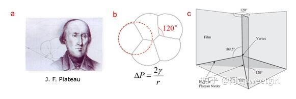 泡沫物理学集中于研究泡沫的结构、静力学、动态演变及排液等内容。它是一个十分古老的学科,由比利时物理学家Plateau在19世纪中叶开创(图2a)。Plateau在数十年的失明的时光里,依旧通过指导他侄子做试验,坚持研究肥皂泡薄膜的几何形态及其背后隐藏的力学规律。1873年,他和侄子把自己的实验现象和分析结果做了系统整理,以法文发表,从此把对泡沫结构的研究由定性印象推到了量化阶段,开创了泡沫物理学(Ref 2)。在泡沫静力学方面,Plateau的主要贡献在于其提出了干泡沫的静态结构力学的三定律,它是后续泡沫研究的基石: