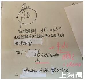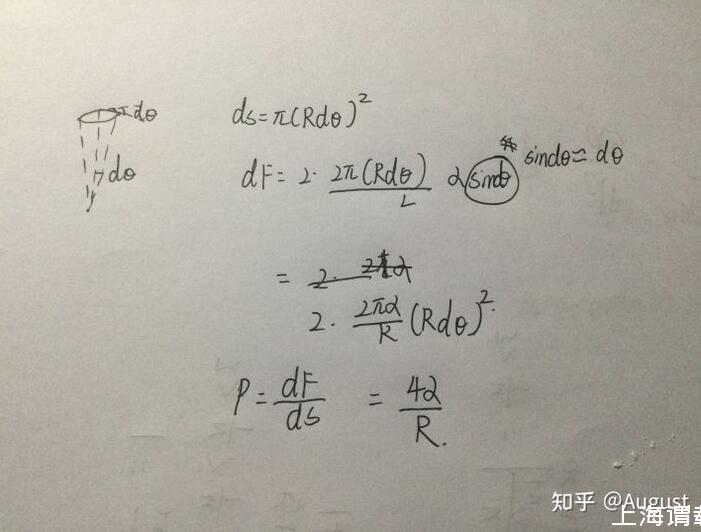 (在这里因为一个肥皂泡膜与两个介值相接触,所以膜的两侧各形成一个表面张力,由于肥皂泡厚度很小,所以这两个表面张力近似相等)