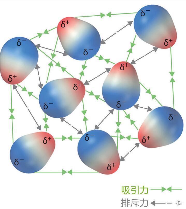 液体分子之间通常存在两种相互作用力:范德华力和氢键,这两种力使分子之间相互吸引又保持一定的距离,它们是由分子的化学电性质决定的。