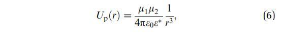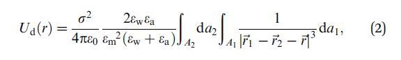 其中Ai表示域i的面积,dai表示其面积元素,-ri表示其相对于域中心的位置向量,i=1,2-r是从域1中心到域2中心的向量,如图1所示。e0是真空介电常数,ew和ea分别是水和空气的相对介电常数。在这里,XVDEVIOS官方下载免费版使用了Urbakh等人21的研究结果,该研究描述了由两个半无限介质包围的薄电介质层中偶极子之间的相互作用。
