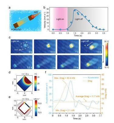 研究人员研制的驱动薄膜中具有光热效应极好的氧化石墨烯(GO)材料,可将光能转换成热能,当光照射漂浮于水面上的驱动薄膜时,薄膜会产生一定的温度并传递给周围的液体,造成局部水温升高进而影响水的表面张力。