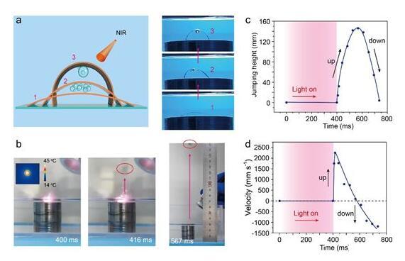 光刺激下驱动器可以在极短的响应时间(400 ms)内从液体介质跳越到空气中,最高速度为2 m/s,高度可达14.3 cm。