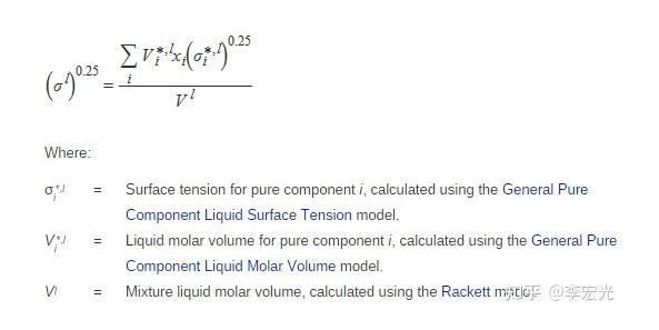 液体的表面张力系数,是液体本身的一种性质,主要由液体本身决定。纯物质液体表面张力可用Macleod-Sugden 法 、Sastri-Rao 法、Brock-Bird 法或Pitzer 法估计[1]。纯物质液体表面张力可用扩展的Macleod-Sugden 法估计[2]:
