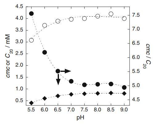 图4 cmc、C20和cmc/C20比值与pH的关系图:白色圆圈cmc、黑色菱形C20、黑色圆圈cmc/C20
