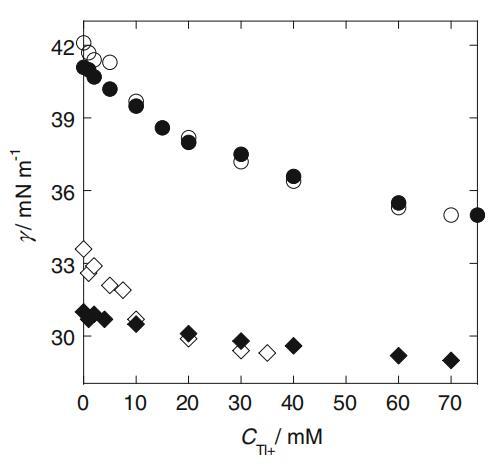 图6不同pH值下取决于Tl+摩尔浓度的界面张力(γ)曲线图:pH=8.0时,SLAS的白圈3.0mm和黑圈4.0mm,pH=5.5时,SLAS的白圈2.5mm和黑圈3.5mm