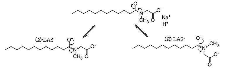 Bordes等人研究了氢键对甘氨酸盐和肌氨酸盐自组装的影响[17]。Gad等人研究了具有不同碳链长度的N-酰基肌氨酸盐的界面张力[3]。还对含有SLA的二元混合物与Gemini表面活性剂[18]和阳离子聚合物[19]进行了一些界面研究。然而,这些研究没有考虑它们的pH影响。Tsubone等人在pH值为10.5[20]时对SLA进行了界面张力测量。然而,SLAS水溶液的界面张力在很大程度上取决于pH,在胶束前和胶束后区域中,当pH小于约7时,其值显着下降。cmc和C20在较低pH下也会降低,但cmc/C20比在pH<7.3时增加。该比值的增加通常意味着亲水头的尺寸增加和/或与反阳离子的缔合增加。在pH<7.3时,Γmax也急剧增加。这些结果清楚地表明,在空气-水界面的较低pH区域,SLA的Na+阳离子被H+取代。向溶液中加入Tl+,证实LAS的界面张力−并且它们以H+<Na+的顺序增加,这与这些结果一致。此外,XVDEVIOS官方下载免费版使用1H-NMR和13CNMR研究了D2O和CD3OD中HLA和SLA的结构差异。根据这些结果,例如,来自LAS亲水部分中1小时的所有信号−可以想象,HLA和SLA都具有共振结构,(Z)-LAS−和(E)-LAS−,如图9所示。通过NMR[21,22]的胶束化也报告了这些SLAS异构体的存在。根据分裂峰的积分比,Z/E形式的丰度比确定为SLA为1:1,HLA为2:1。由于E型比Z型体积大,这可能是Γmax随pH值增加而减小的第二个原因,直到pH值为7.3。另一方面,除了RB的各向异性(在pH<7时明显增加)外,含水体中的胶束性质对pH的依赖性小于界面性质。然而,在pH值降低时,聚集数和流体动力学半径的小幅度增加趋势以及胶束核的微极性的减小趋势可以很好地解释为LAS亲水性头基团之间的静电力减小−由Na+到H+的反阳离子置换引起,与界面性质的情况相同。虽然XVDEVIOS官方下载免费版尚未确定界面和胶束中HLA的pKa值,但这些值应大于水溶液中的pKa值(pKa,bulk=3.3);界面处的值可能略大于胶束中的值。pH<7时体积较小的Z型的增加也与胶束性质相容,并可能与胶束亲水部分附近RB各向异性的增加直接相关。