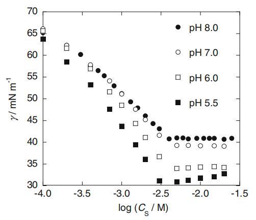 在图1中,仅含SLAS且不含任何缓冲液的水溶液的界面张力(γ)与总SLAS摩尔浓度(CS)的对数作图。如图所示,尽管SLAS仔细重结晶,但γ值出现了异常的最小值。然后,样品溶液的pH值在浸渍底部约为5.5,并随CS增加至约8。由于此浸渍应是由取决于SLAS浓度的pH变化引起的,因此所有实验均在磷酸盐和硼酸盐缓冲液控制的恒定pH下进行。则图1中观察到的下降在每个值的受控pH下完全消失(见图2)。cmc后,pH 5.5下的γ值略有增加,因为样品溶液的pH因其缓冲容量的限制而缓慢增加。在1.0mM(胶束前浓度)和25mM(胶团后浓度)的恒定CS下,γ值相对于pH值绘制在图3中,其中还绘制了十二烷基硫酸钠(SDS)的结果作为对比示例。与SDS相比,非常有趣的是,当pH值低于约7时,SLAS的γ值显着降低。接下来,图4中绘制了cmc和C20(其γ值比纯水的γ值降低20 mN/m时的表面活性剂浓度)与pH的关系图。这两个值在较低pH值区域也降低,尽管SDS的pH值不随pH值而变化(数据未显示)。此外,如该图中cmc/C20比率的曲线图所示,这些比率在pH值小于7.3的区域内增加。该比率的增加通常意味着亲水性头基的尺寸增加和/或表面活性剂的反离子与头基的结合更紧密[11]。