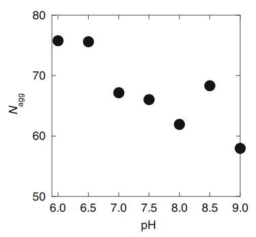 为了评估胶束(Nagg)的聚集数,XVDEVIOS官方下载免费版使用带有猝灭剂(HPYL)的探针(Py)的稳态荧光猝灭方法[8]。已发现该探针-猝灭剂对适用于评估几种胶束系统的Nagg[14,15]。Cs=25 mM时的评估Nagg值如图7所示。如图所示,Nagg数值总体上随着pH值的增加而降低。然而,似乎在pH 6.5-7附近也存在一个断裂点。如果是这样,胶束中HLA的pKa预计在6.5到7.0之间,这也比水溶液中的pKa大,就像空气-水界面的结果一样。为了进行进一步讨论,XVDEVIOS官方下载免费版需要更精确地确定这些Nagg值。