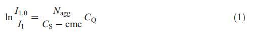 为了通过稳态荧光猝灭法评估胶束的平均聚集数(Nagg),使用芘作为荧光探针,选择HPYC作为静态猝灭剂[8]。该方法基于已知浓度的猝灭剂对发光探针的猝灭。通过使用以下等式[8]分析淬火实验: