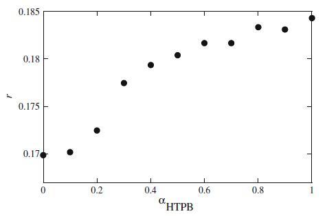 图8 HTPB+Mega-10混合体系的荧光各向异性r与αHTPB的关系图