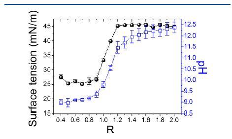 图3.氢氧化胆碱/肉豆蔻酸分散体的表面张力(黑色圆圈)和pH(蓝色正方形)随25°C下摩尔比R的变化。