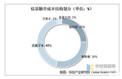 从上游成本结构来看,烷基糖苷主要原材料是去离子水、葡萄糖和脂肪酸,分别在成本结构占比43%、30%、25%。
