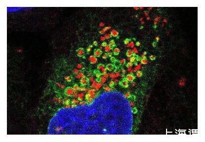 荧光显微图像显示了内质网(绿色)像毯子一样包裹住受损的溶酶体(红色),细胞核以蓝色显示。