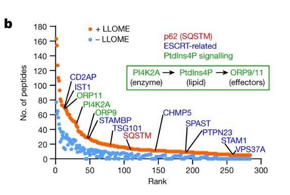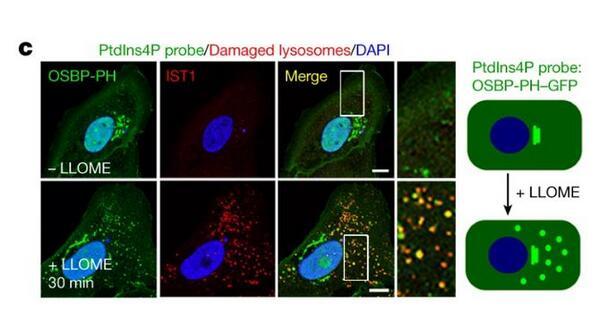 首先,研究者用生物素对溶酶体表面的所有蛋白进行了标记,然后通过组学方法来寻找溶酶体受损后,表面特异性富集的蛋白。此研究发现,溶酶体一旦受损,在短短几分钟后,一种叫PI4K2A的激酶就会到达现场,随后导致脂质信号PI4P(磷脂酰肌醇4-磷酸)大量富集于溶酶体表面。