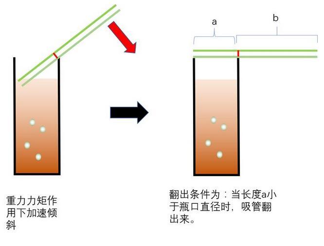 达到位置最高时,速度为零,这时,重力大于浮力,重力矩的作用下,加速倾斜。那么什么情形下,吸管会翻出来呢?显然是吸管翻出时,不被瓶壁阻挡时,才可以翻出来。