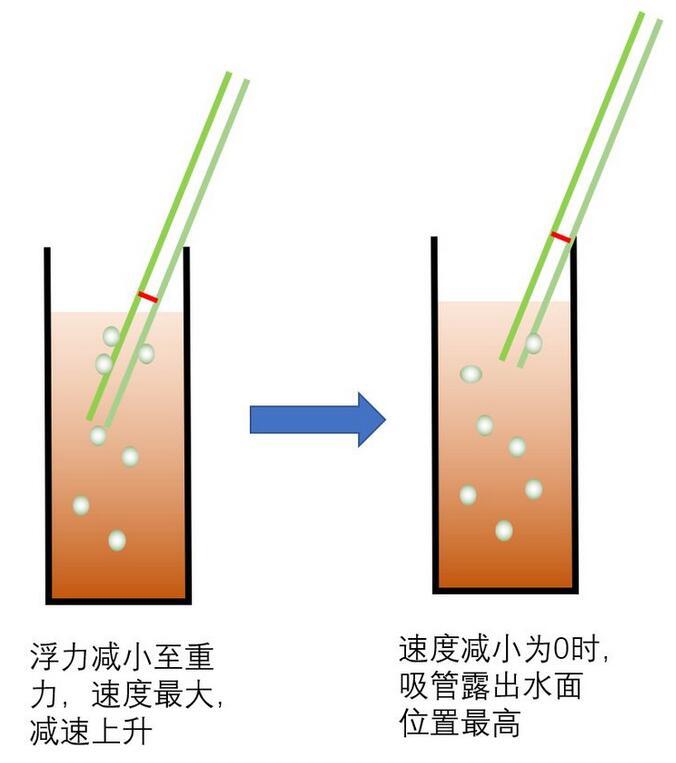 这时上升过程中,吸管可能因为左右两侧吸附的气泡数量不同而发生浮力差异而倾斜。也可能因为外界扰动而发生倾斜,反正吸管竖直上升的可能性很小。习惯倾斜碰到瓶壁后继续上升,上升带来气泡的减少,吸管自身浮力的下降。当浮力减小到小于重力时,这时开始i减速,直到速度为零。如下图所示;