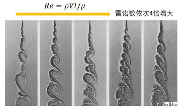 随着雷诺实验和雷诺数被提出来以后,近代流体力学,尤其是湍流理论的发展出现了一个前所未有的盛况,而粘性与湍流的关系也顺理成章的转化成了雷诺数和湍流的关系。1974年刊登于《流体力学》期刊中的一篇经典文章,通过流动显示技术生动形象的描绘了雷诺数和流态的关系:随着雷诺数的增大,涡旋的整体形状和尺度基本一致,然而射流掺混的涡系结构却越来越丰富。