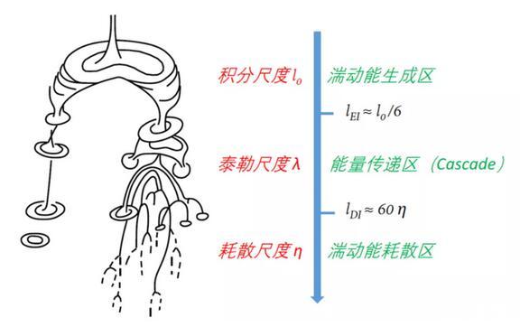 而之所以会出现上图中的有趣现象,则要牵扯到湍流的生成、传递及耗散:湍流中的大涡会破碎为小涡,小涡再破碎为更小的“迷你涡”,然后逐渐耗散,这个过程与当地雷诺数相关。当“迷你涡”变得足够小时,根据角动量守恒,涡的角速度将会非常大,意味着局部速度剪切很强,粘性就变得举足轻重了,于是,“迷你涡”就这样被粘性耗散掉了。事实上,涡的尺度足够小时,体现为当地雷诺数非常小,粘性力对流体的影响则显著大于惯性力。