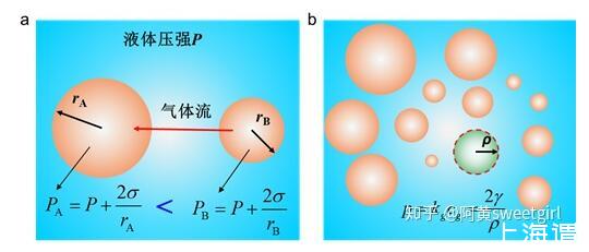 气泡液体是大小不同的球状气泡分散到液体中的液气体系。在气泡液体中,大小不同气泡是一个不稳定的体系,其内部不等的压强会使整个体系变化,总体趋势是气泡半径出现粗化现象,这种粗化跟晶体生长中的Ostwald熟化的现象是一致的(Ref 1)。根据附加压力公式,可知较小的气泡其内部具有较大的压强,因此与旁边较大的气泡间就会存在压强差(图1a),气泡间液体两侧的压强差会使气体从压强较大的地方向较小的地方扩散,从而出现大的气泡增大,小的气泡减小直至消失的情形,这就是气泡Ostwald熟化的机理(Ref 2)。从能量的观点来说,Ostwald熟化的结果降低了体系的表面能,从而使整个体系更加稳定。