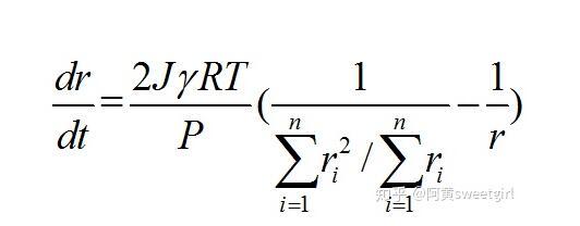 假设气体符合气体理想气体方程,即PV=nRT,对于球形气泡,体积V=4πr^3/3,从而可把摩尔速率转化为气泡半径变化的速率。通过以上各式,可得