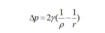 从定性的角度来看,气泡的Ostwald熟化的过程是大气泡吸收小气泡的过程。但从定量上的角度来说,在气泡演变的任一时刻,到底尺寸为多少的气泡倾向为长大,而尺寸为多少的气泡减小而倾向于消失呢?1978年,美国辛那提大学的Robert Lemlich建立模型解决了这个问题(Ref 3)。Lemlich的理论核心和依据是:1)假设所有的气泡内的液体相互扩散时,都是先把气体扩散到液体中,再通过液体扩散到其他气泡中实现Ostwald熟化过程(图1a),这个假设在气泡含量不高,不是相互接触的情形下是合理的。2)在气泡演化的任何一个时刻,液体中气体的浓度是均匀一致的,这个假设在研究所有气泡的演化整体行为上是可行的。3)依据亨利定律,这个液体中气体的浓度可以等价为液体内部有一个气体压强,而这个压强可以看成是一个假想的气泡内部的压强(图1b),其半径ρ可以依据Laplace方程计算出来。所以,所谓气泡演化就是所有气泡跟这个假想的气泡进行气体交流。这样就把体系中气泡演变多对多扩散的复杂情形简化为了多对一的演变过程。由此,体系中任意一个半径为r气泡与这个液体的中假想的气泡的压强差△P为