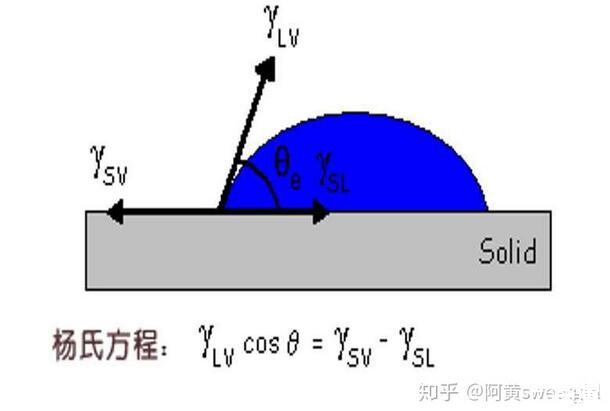 聚合物为固体时,它的表面张力的测定就没那么简单了。根据不同的情形,有几种不同的方法去测定。一种容易理解的方法是使用两种液体在固体表面上分别测出接触角,分别建立杨氏方程,然后联立杨氏方程消除未知量。杨氏方程如下: